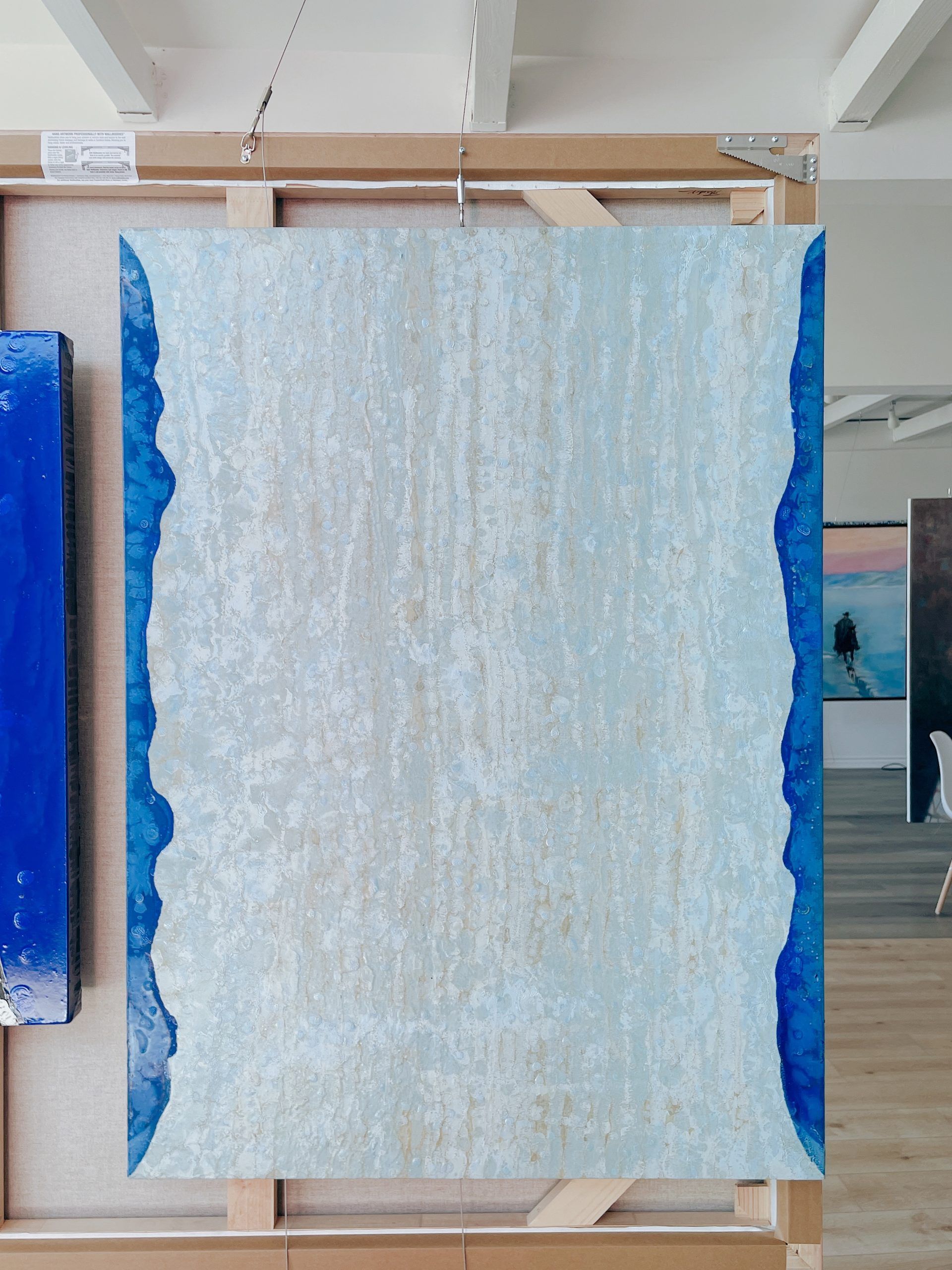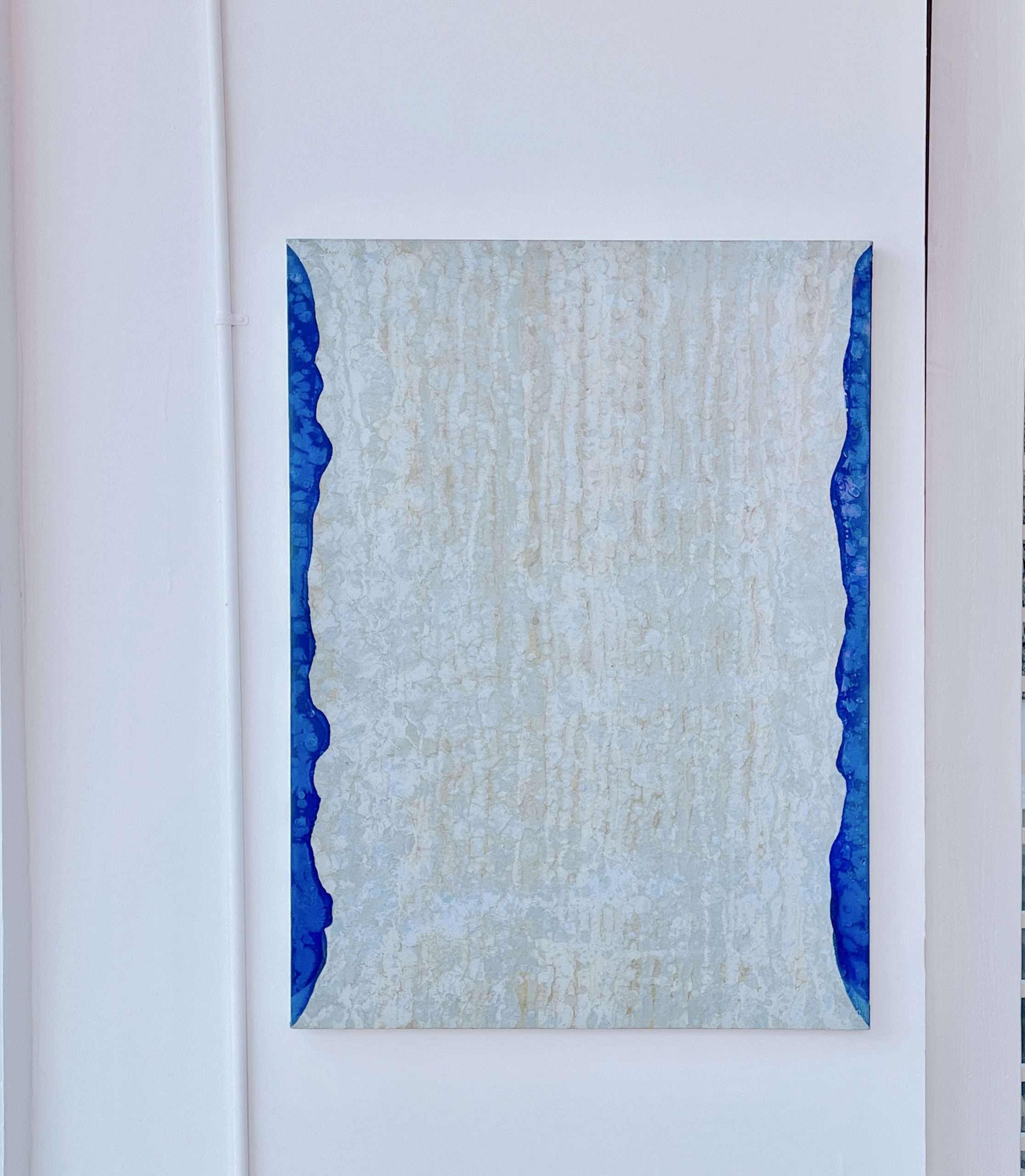 A predominantly textured white canvas that evokes a sense of untouched snow or a frosted windowpane, interrupted by a sinuous, rich blue form that snakes along the right edge.