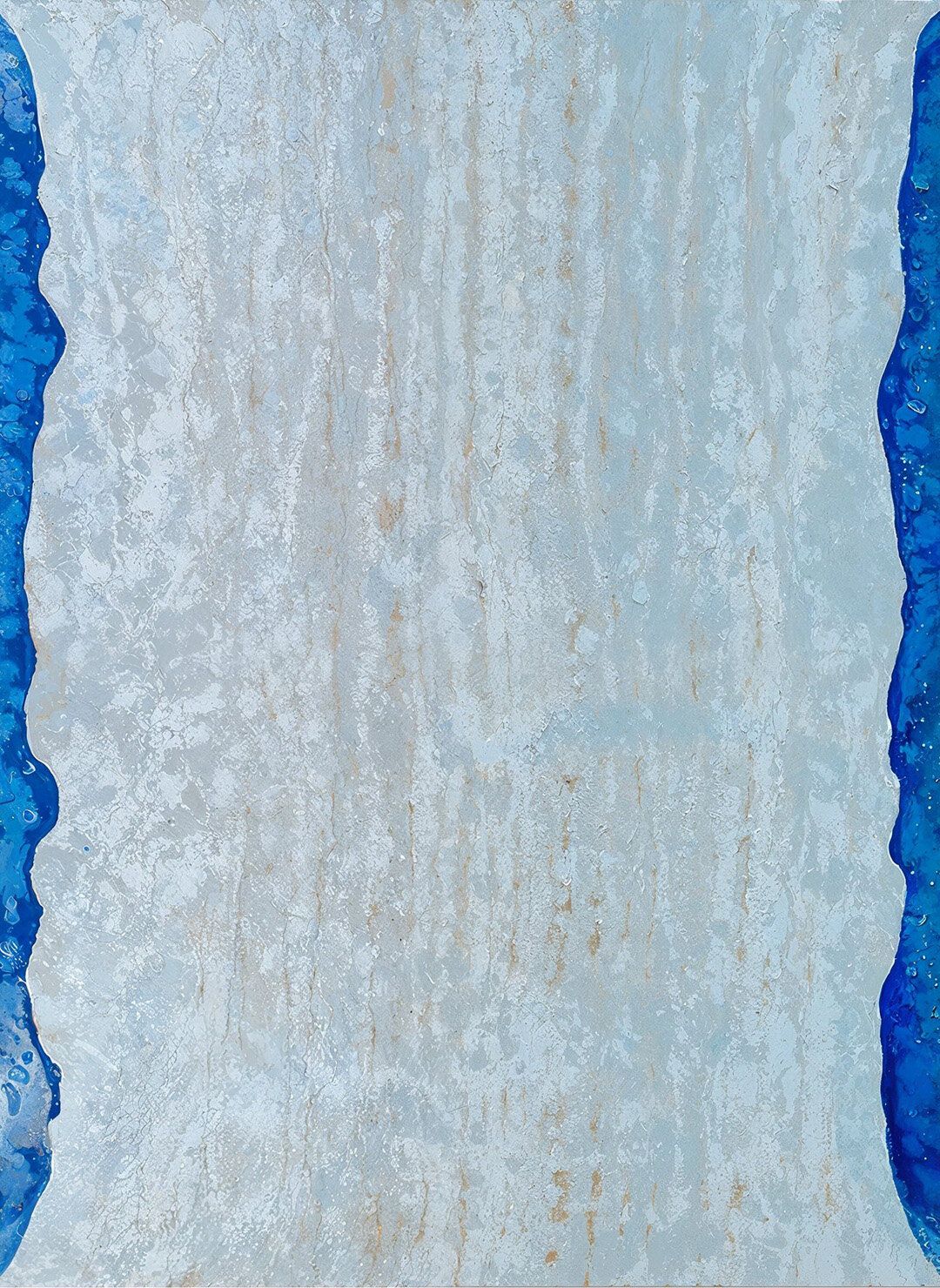 The contrast between the rugged, almost corrosive texture of the white area and the smooth, flowing quality of the blue suggests a dynamic interplay between elements.