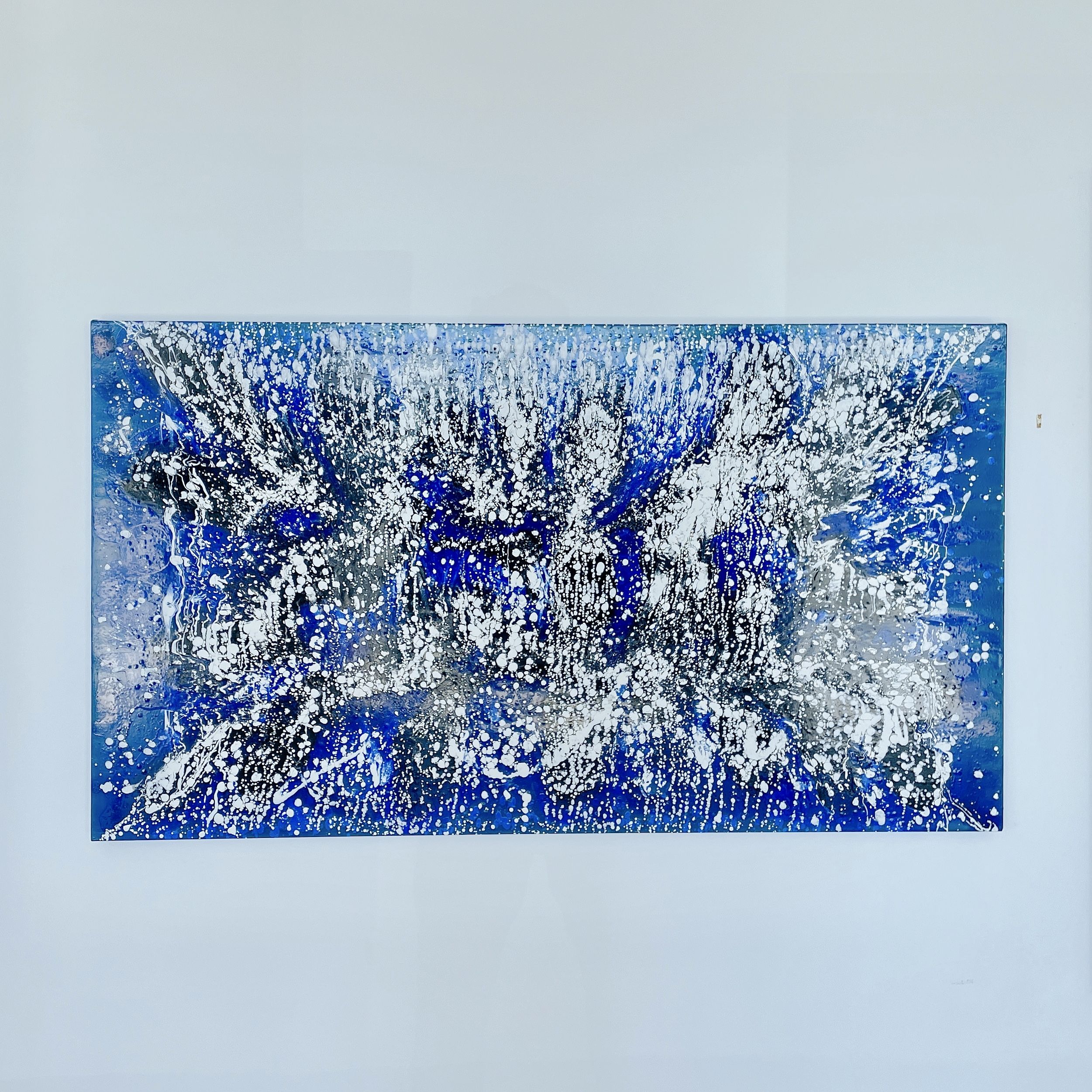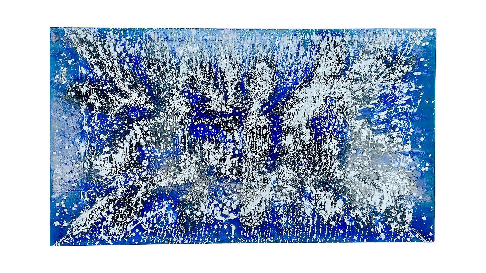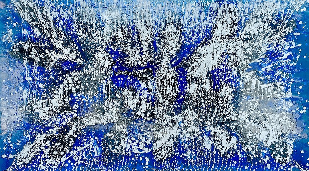 The piece is structured around a central explosion of white against deep and lighter blues, suggesting the tumultuous activity of water as it reacts to underwater currents and forces. The use of oil paint allows for layering and depth, giving the piece a three-dimensional effect that pulls the viewer into its depths. This work combines the tranquility of deep blues with the violent force of white caps, capturing the dual nature of water as both a peaceful and powerful element.