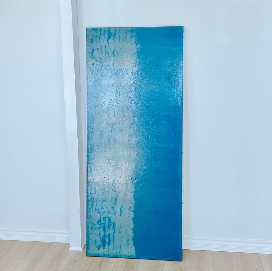 A striking use of blue and white to create a luminous, layered effect that mimics the streaming of light. Brunswick’s technique involves thick, textural layers of paint, creating a tactile surface that enhances the light-reflective qualities of the canvas.