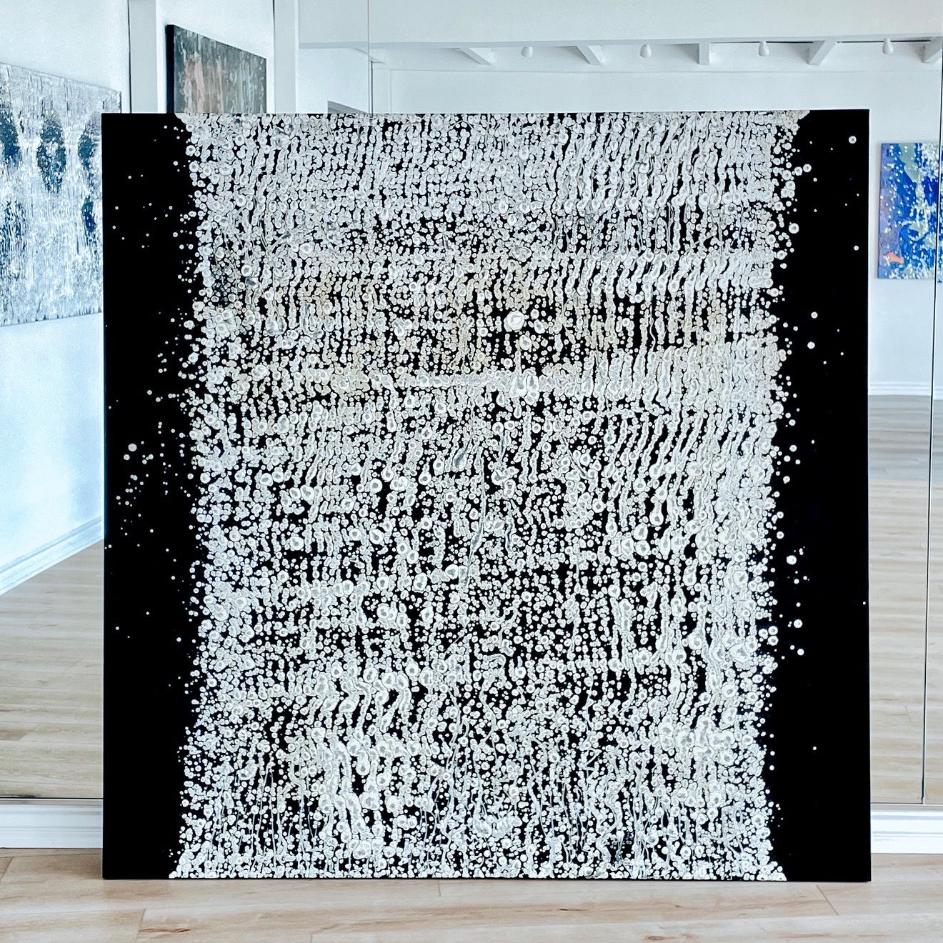 A dynamic interplay of texture and form. The canvas is dominated by a vigorous deployment of white oil paint over a somber black background, which might suggest a metaphorical “giant” in visual form, or perhaps an abstract interpretation of a primeval, tumultuous landscape.