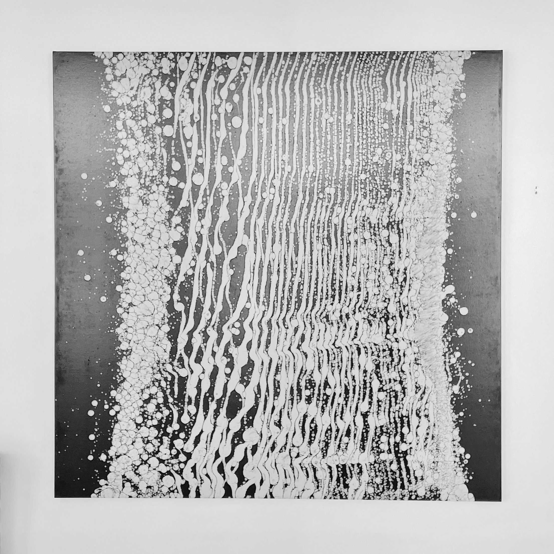 A graceful, almost ethereal visual experience. White paint is applied in a variety of droplets and elongated drips against a gradated background, creating a contrast that evokes both the gentleness of light rain and the powerful surge of waterfalls.