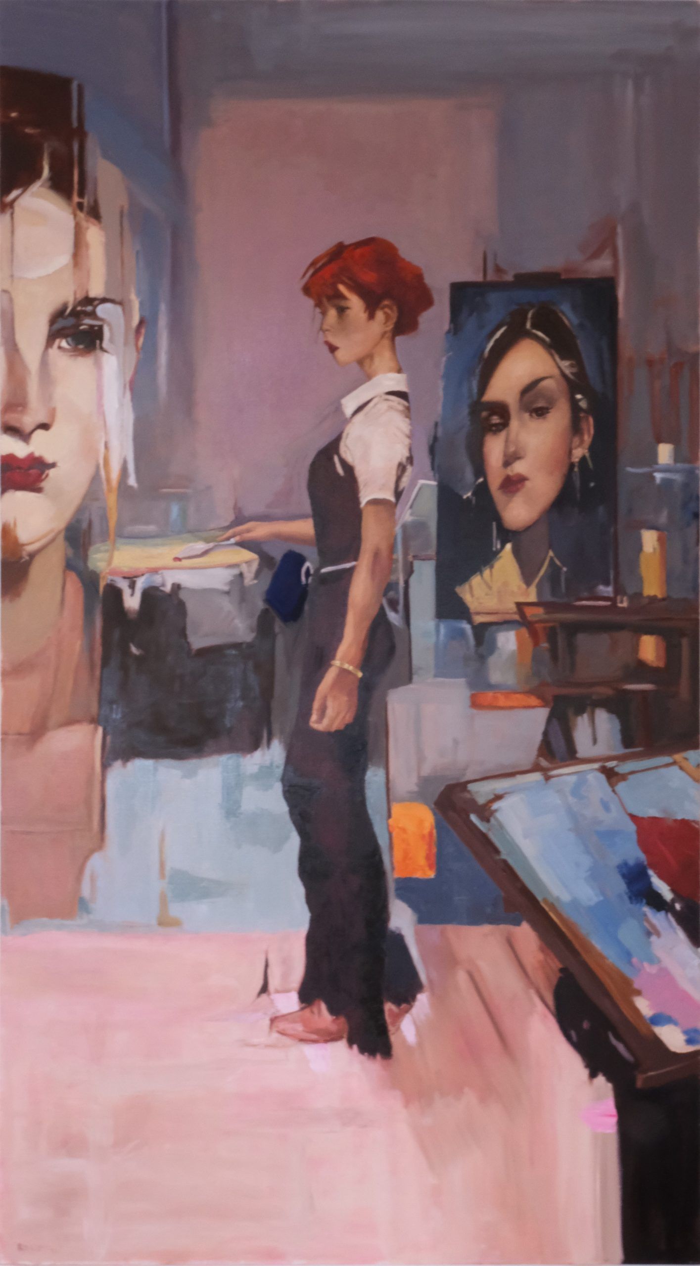 The inclusion of other portraits within the painting adds layers of depth and narrative, as if each canvas tells a part of her story. The use of soft, yet vivid colors enhances the intimate atmosphere of the studio, while sharp contrasts and detailed brushwork emphasize the textures of the linen and the tactile quality of her work environment.