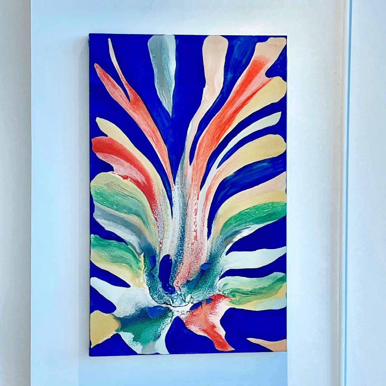 These colors are applied with a spontaneous yet thoughtful brushwork that mimics the organic and fluid motion of feathers ruffling in the breeze. The deep blue background contrasts starkly with the vivid colors, enhancing their luminance and giving the composition a profound depth, as if the viewer is looking into an endless sky. This painting is not just a visual treat; it’s a visceral experience that captures the freedom and grace of flight.