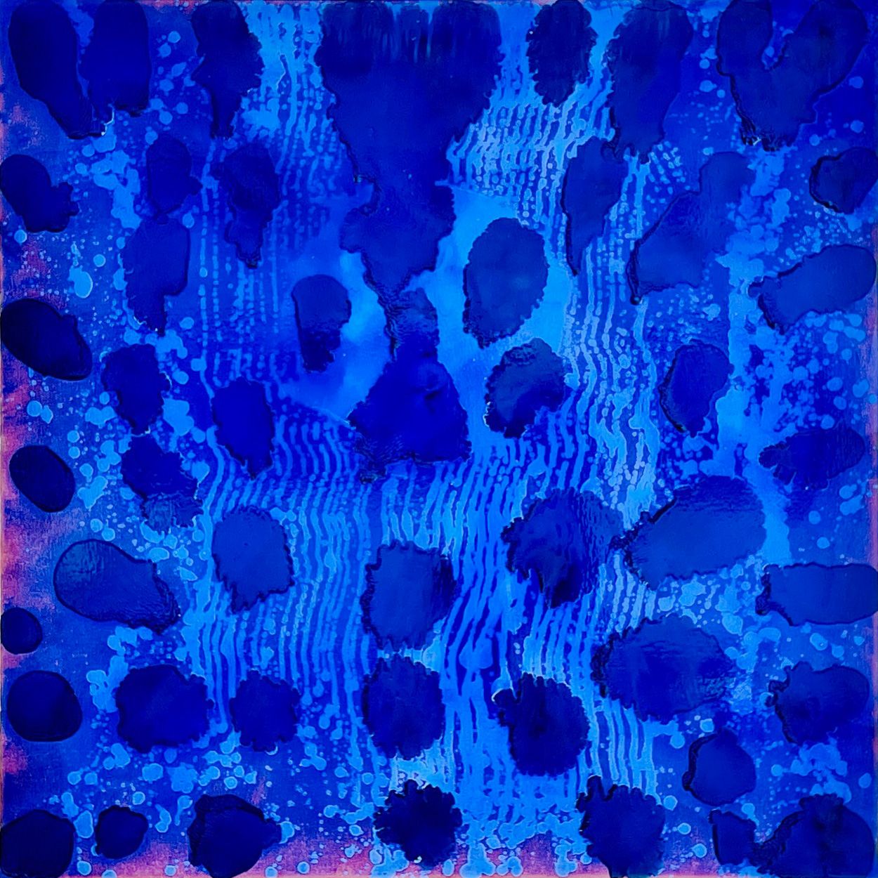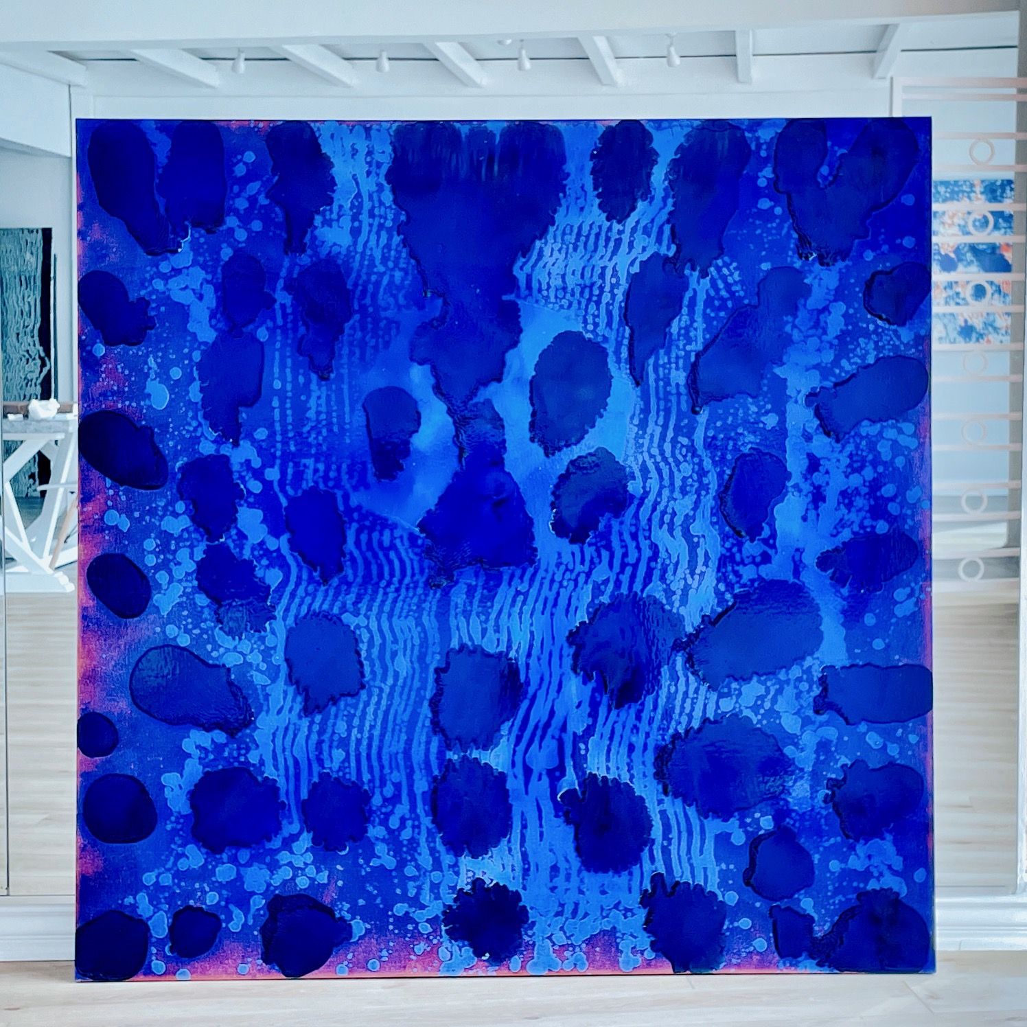 The abstract nature evokes a sense of fluidity and dynamism, reminiscent of water or celestial phenomena. The vibrant blues create a calming yet captivating atmosphere, drawing the viewer into its detailed and textured design. The powerful use of color and form invites continuous exploration and interpretation.”