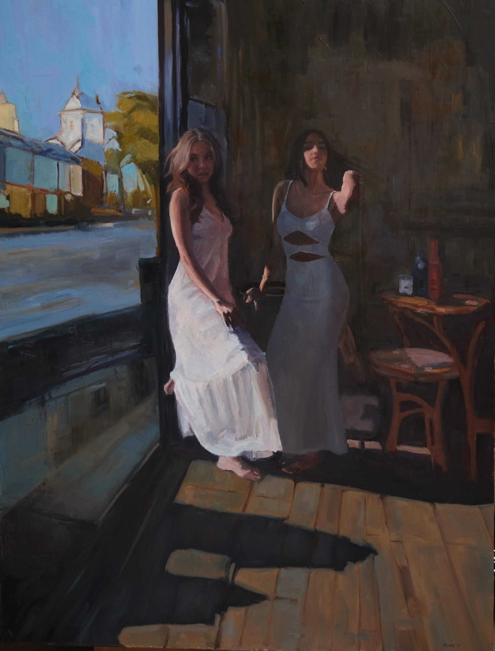 The second woman stands slightly behind, dressed in a modern white outfit with cutouts, looking out the window. The contrasting styles of their dresses—one classic and flowing, the other modern and structured—highlight their individual personalities.