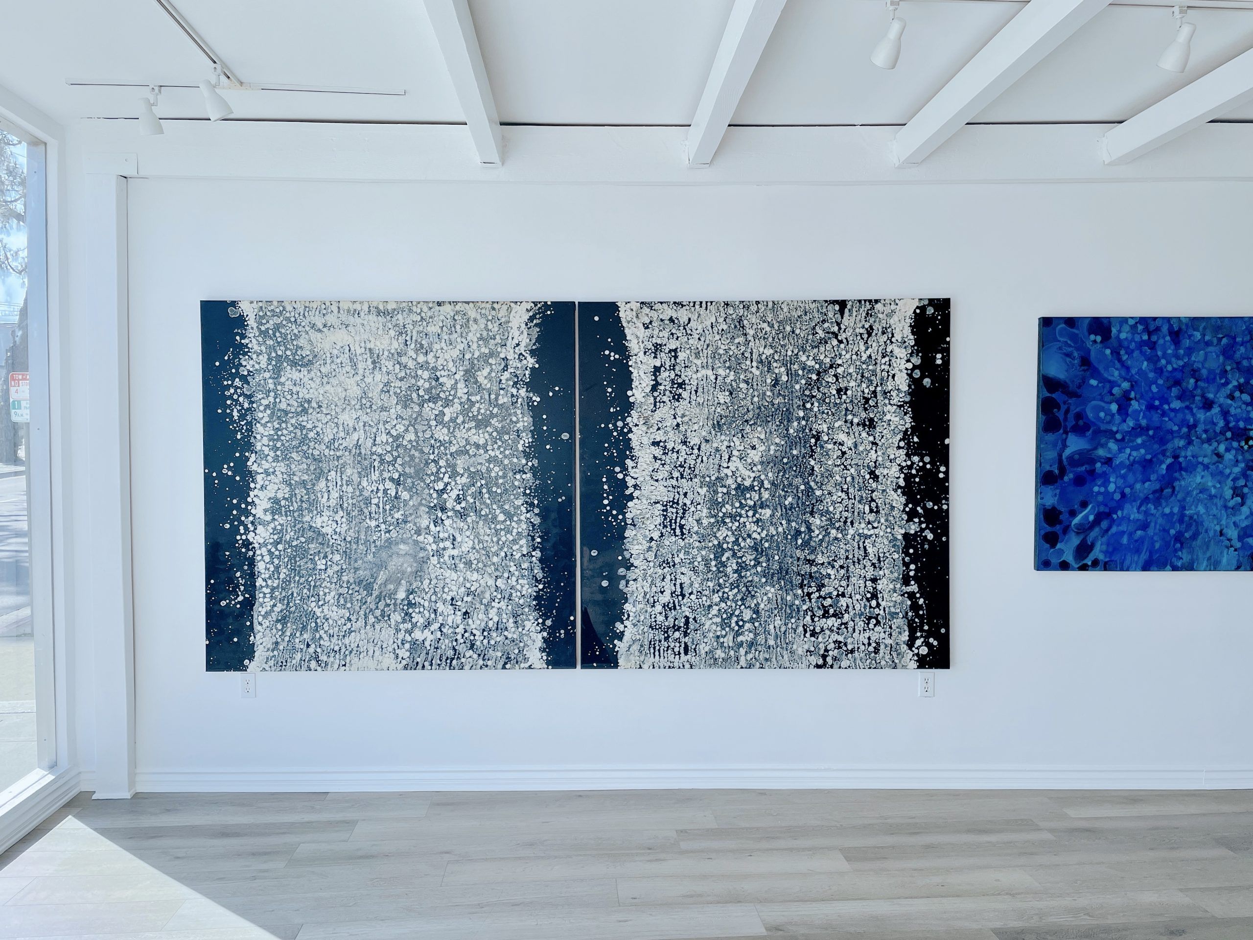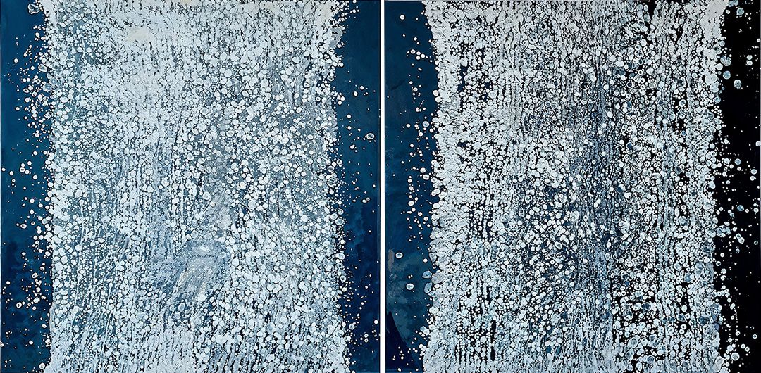 A rich, deep background intersected by a vivid central divide that enhances the artwork’s dual-panel structure. The surface of each panel is animated with an explosion of white and gray speckles that mimic the chaotic beauty of a natural process, perhaps evoking thoughts of a starry night or a frothy ocean wave. This texture not only invites a closer look but also suggests a microscopic or celestial scale, blurring the lines between the macroscopic and microscopic worlds.