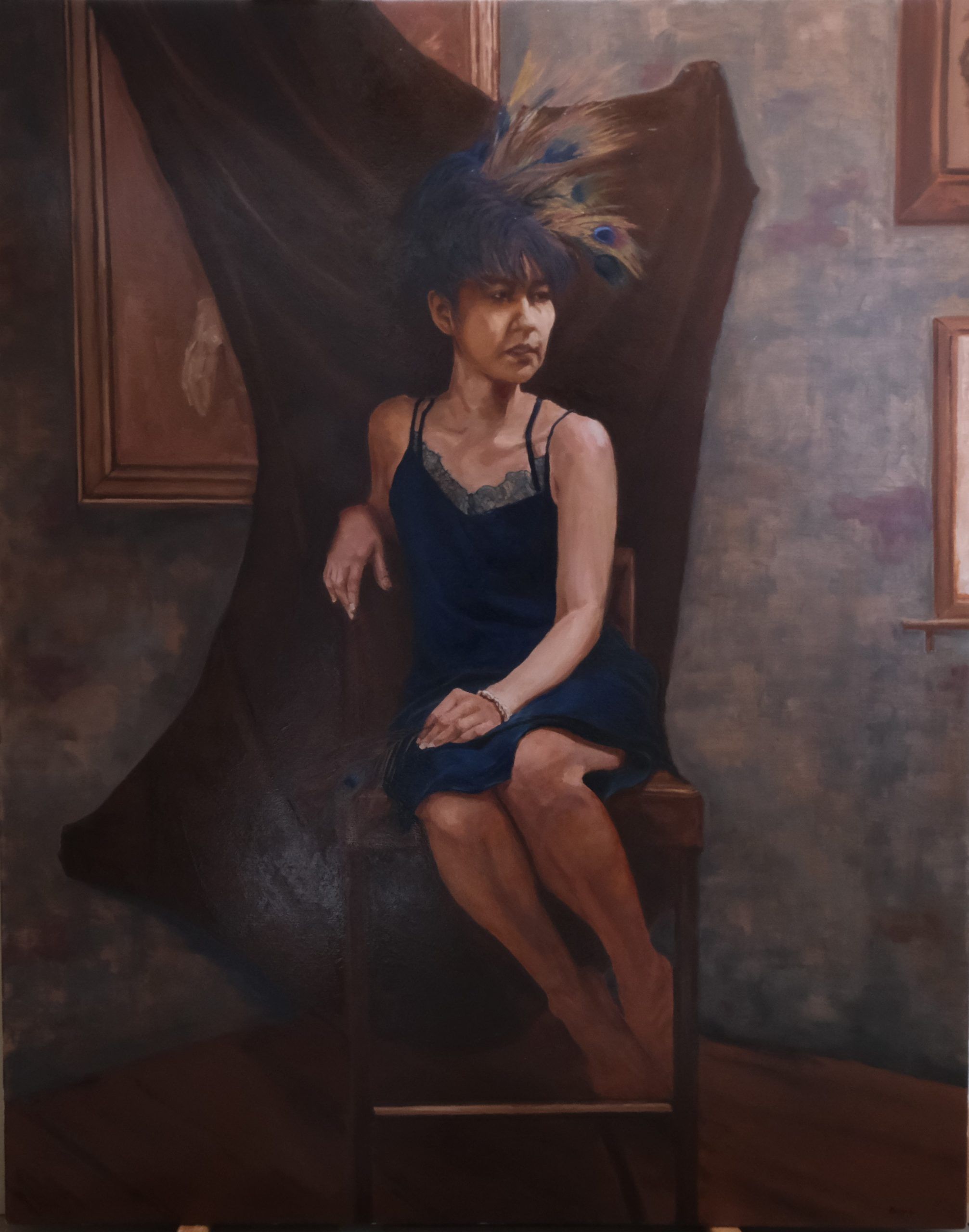 The peacock feather in Ren’s hair stands out both in color and symbolism, often associated with vanity and beauty, but here it might hint at underlying themes of identity and perception. The dress, simple yet elegant, along with the understated jewelry, suggests a casual yet thoughtful approach to self-presentation.