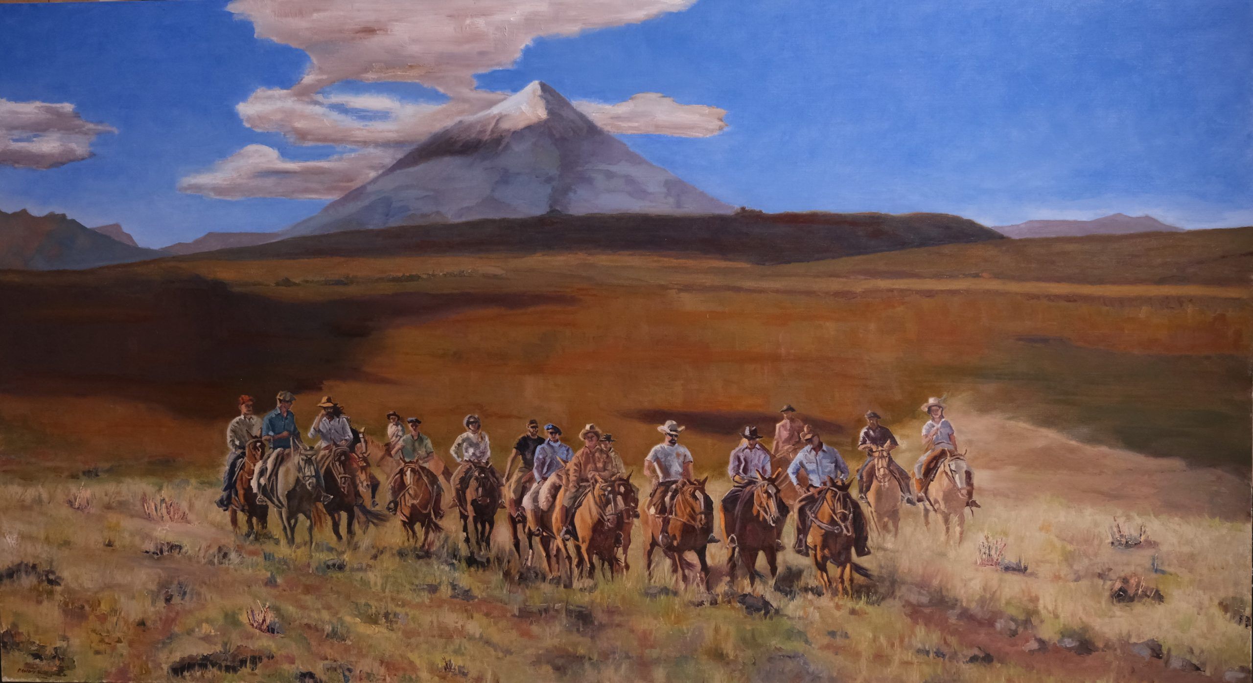 The soft, warm colors of the landscape contrast with the cool blues and whites of the sky, creating a vivid and atmospheric setting. Wheeler’s use of light and shadow, along with his attention to the textures of the landscape and the figures, brings this moment to life with a palpable sense of presence and place.
