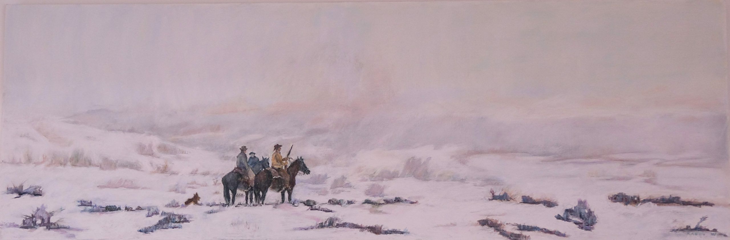This painting captures a moment of resilience against the elements, as a small group of riders and their horses move through a vast, desolate winter landscape.