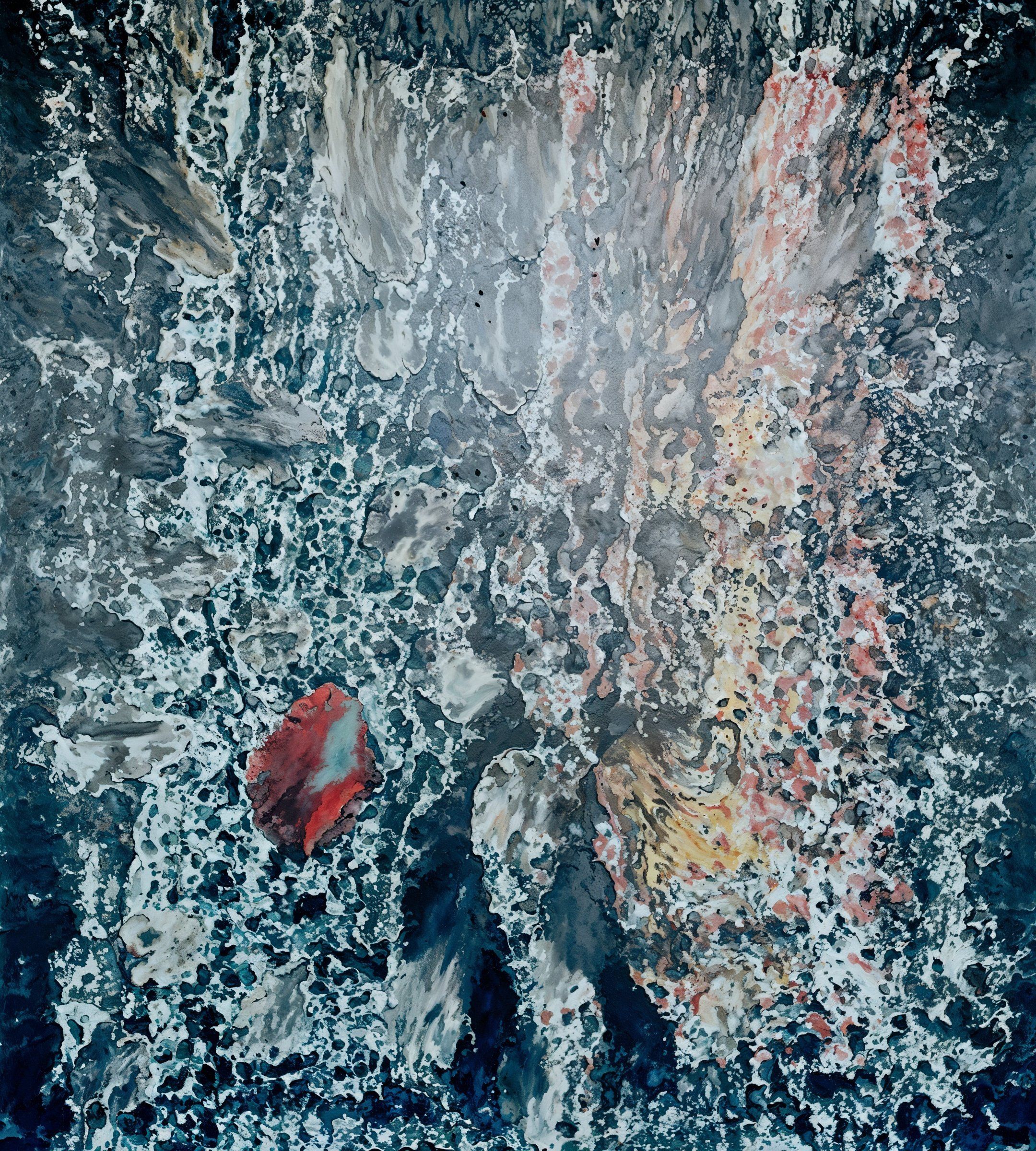 A dynamic and turbulent expression of color, with deep blacks, grays, and whites forming a tumultuous background that suggests a stormy sky or a rugged terrain.