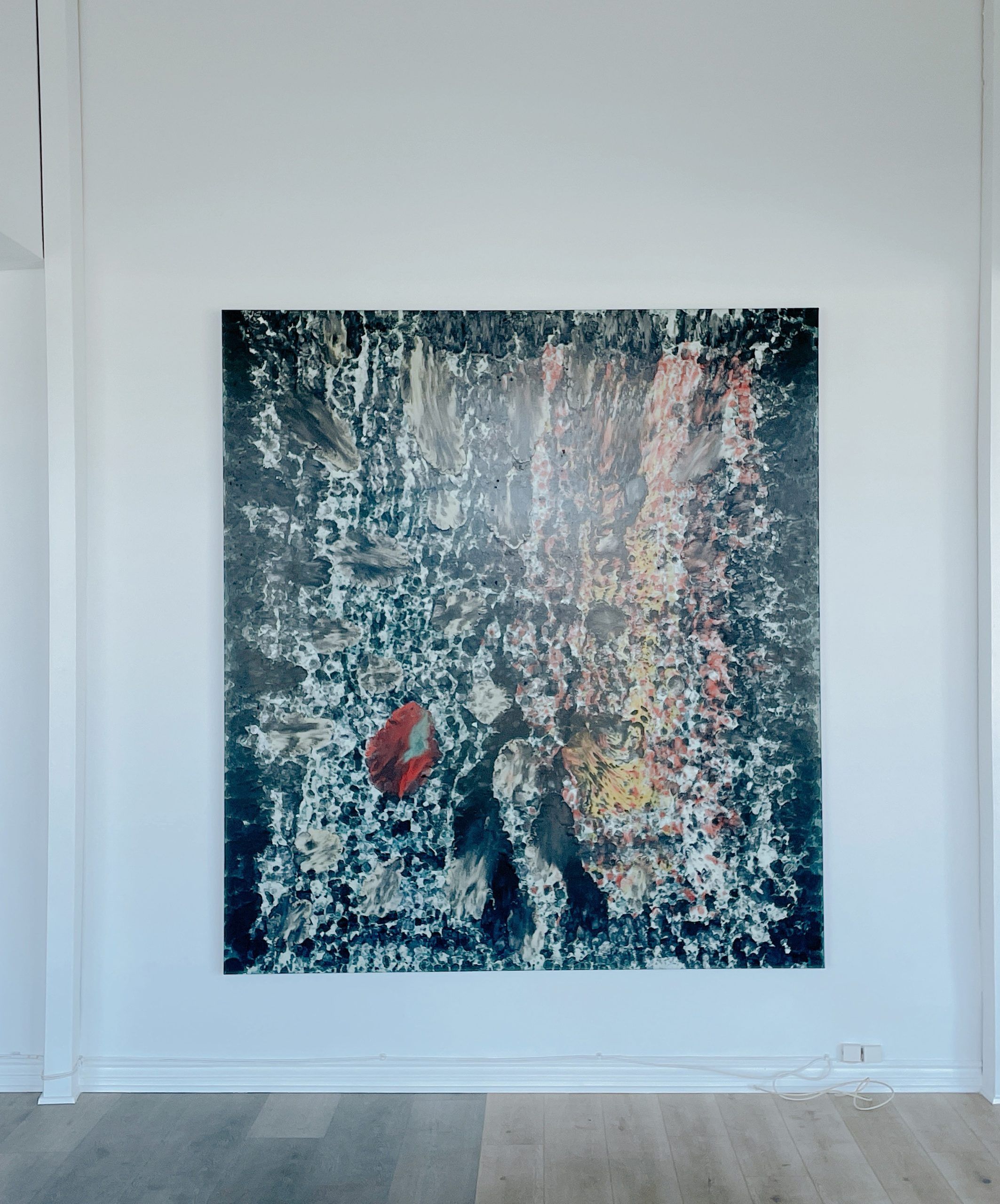 Bursts of red and shades of pink at the center mimic the appearance of roses, providing a vivid contrast to the darker tones. The painting’s scale and the intensity of the brushwork create an immersive experience, drawing viewers into a sensory exploration of color and form.