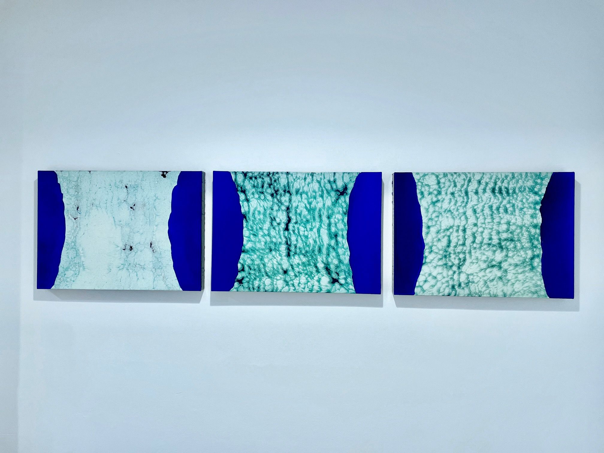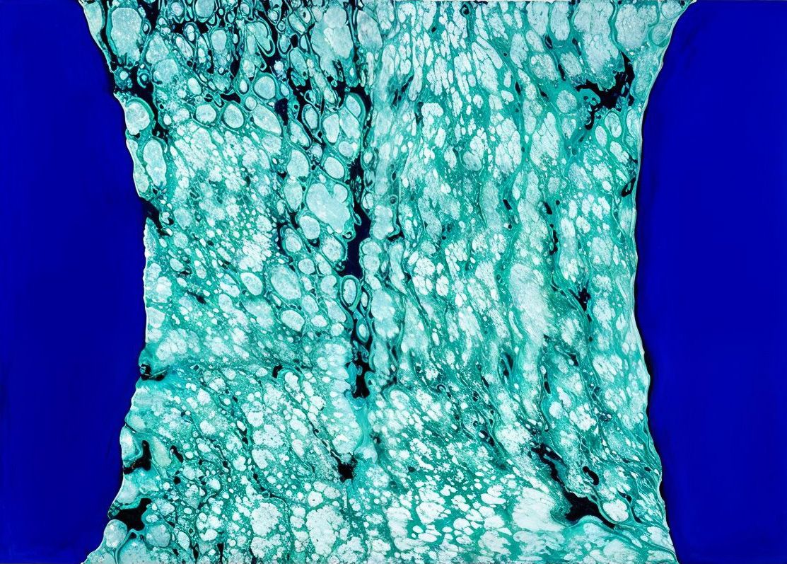 The composition is dense with color, yet it maintains a harmonious balance, allowing the eye to travel across the canvas without rest. This visual complexity mimics the lyrical ambiguity and emotional depth of Dylan’s song, making the painting not just a visual experience but a narrative one as well. The large square format emphasizes the engulfing nature of the color blue, inviting the viewer to lose themselves in the depths of the painting’s textures and hues.