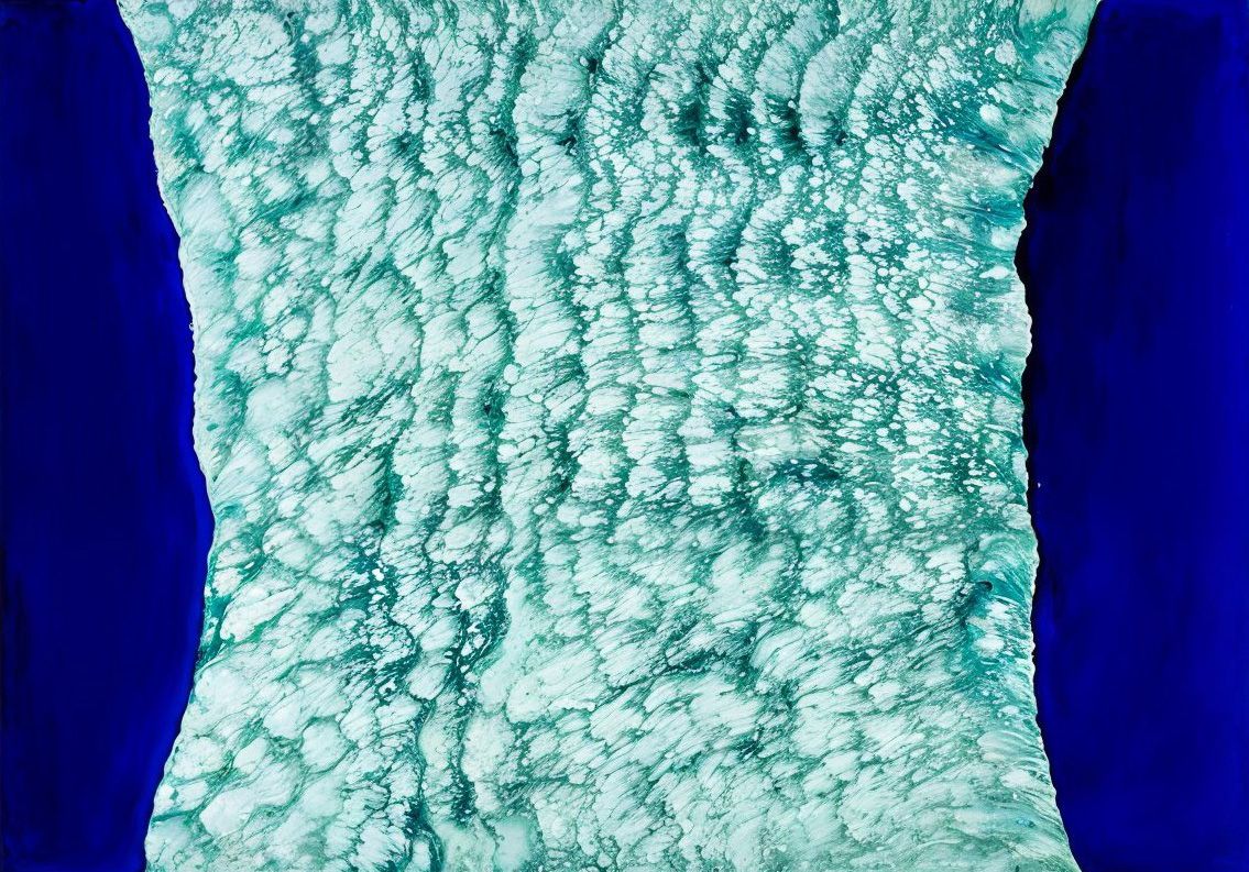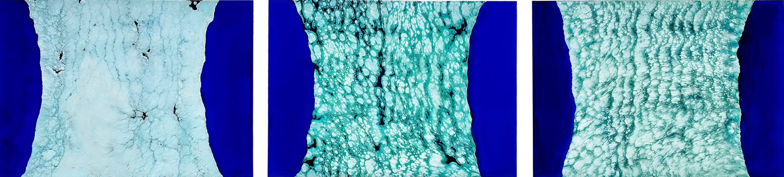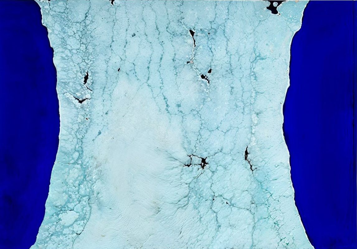 A lively interplay of color and texture, with the paint applied in thick, swirling layers that create a sense of movement and depth. The varying shades of blue are complemented by hints of white and lighter blue, which give the impression of light reflecting off water or ice.