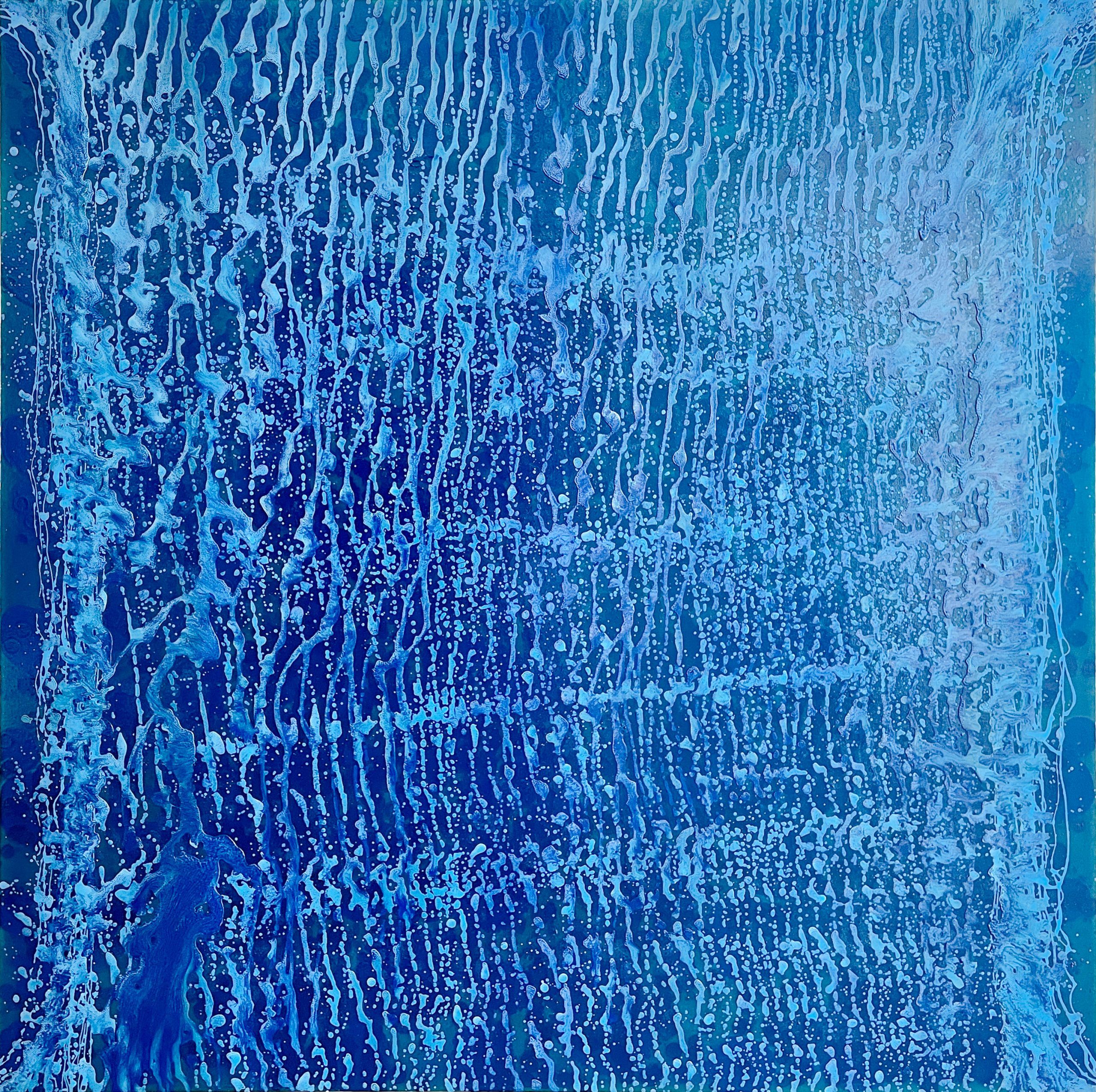 A lively interplay of color and texture, with the paint applied in thick, swirling layers that create a sense of movement and depth. The varying shades of blue are complemented by hints of white and lighter blue, which give the impression of light reflecting off water or ice.