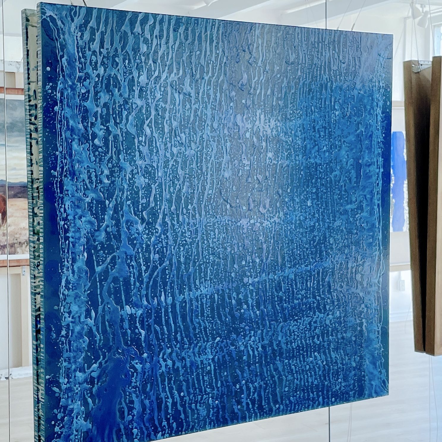 The composition is dense with color, yet it maintains a harmonious balance, allowing the eye to travel across the canvas without rest. This visual complexity mimics the lyrical ambiguity and emotional depth of Dylan’s song, making the painting not just a visual experience but a narrative one as well. The large square format emphasizes the engulfing nature of the color blue, inviting the viewer to lose themselves in the depths of the painting’s textures and hues.
