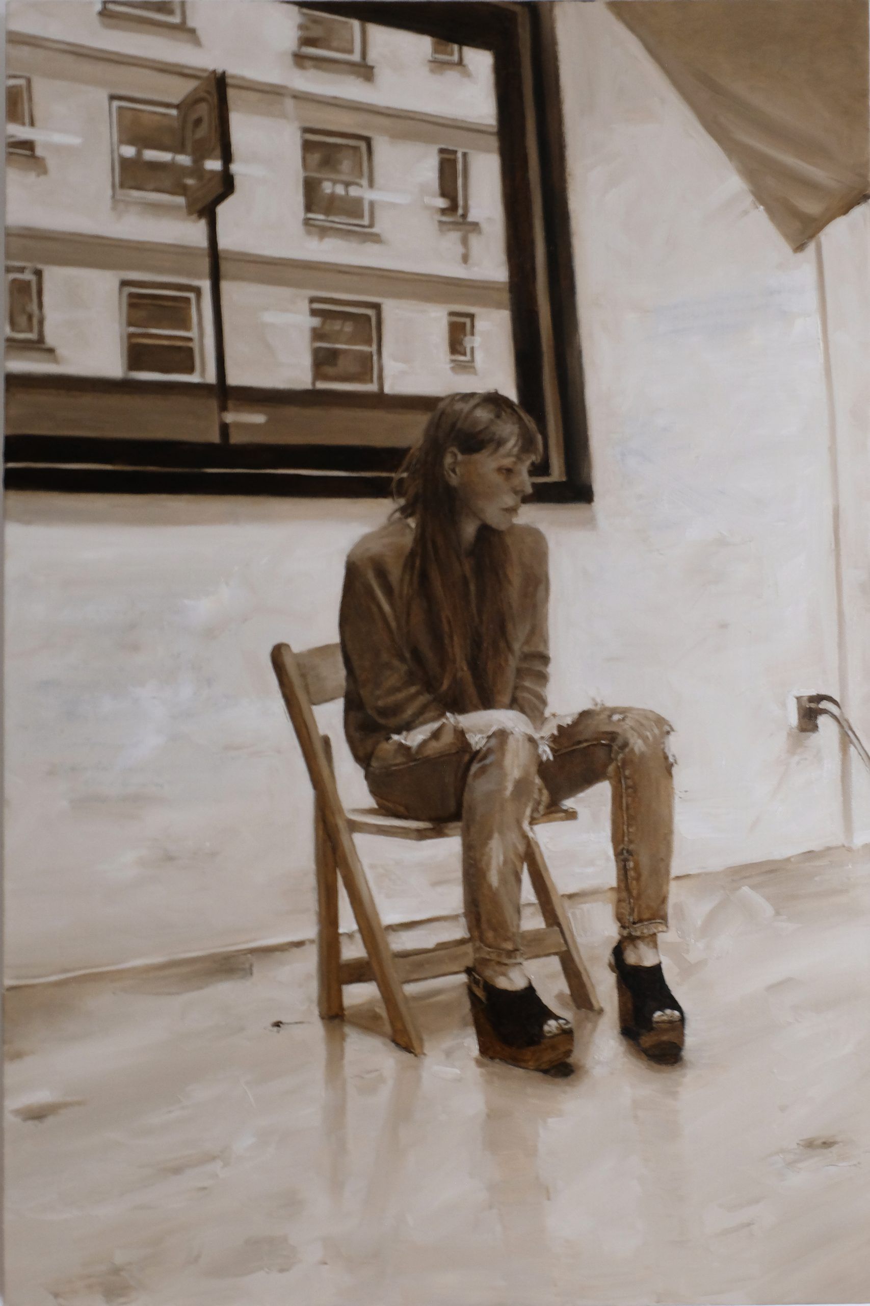A young woman sitting on a simple wooden chair, her gaze directed away from the viewer, lending a sense of introspection to the scene. The background, a stark depiction of a cityscape seen through a large window, contrasts sharply with the soft, detailed rendering of the model. The monochromatic palette, primarily shades of brown and cream, focuses attention on the textural contrasts between the smoothness of the walls and floor and the detailed textures of the woman’s clothing and hair.